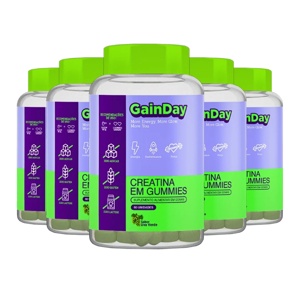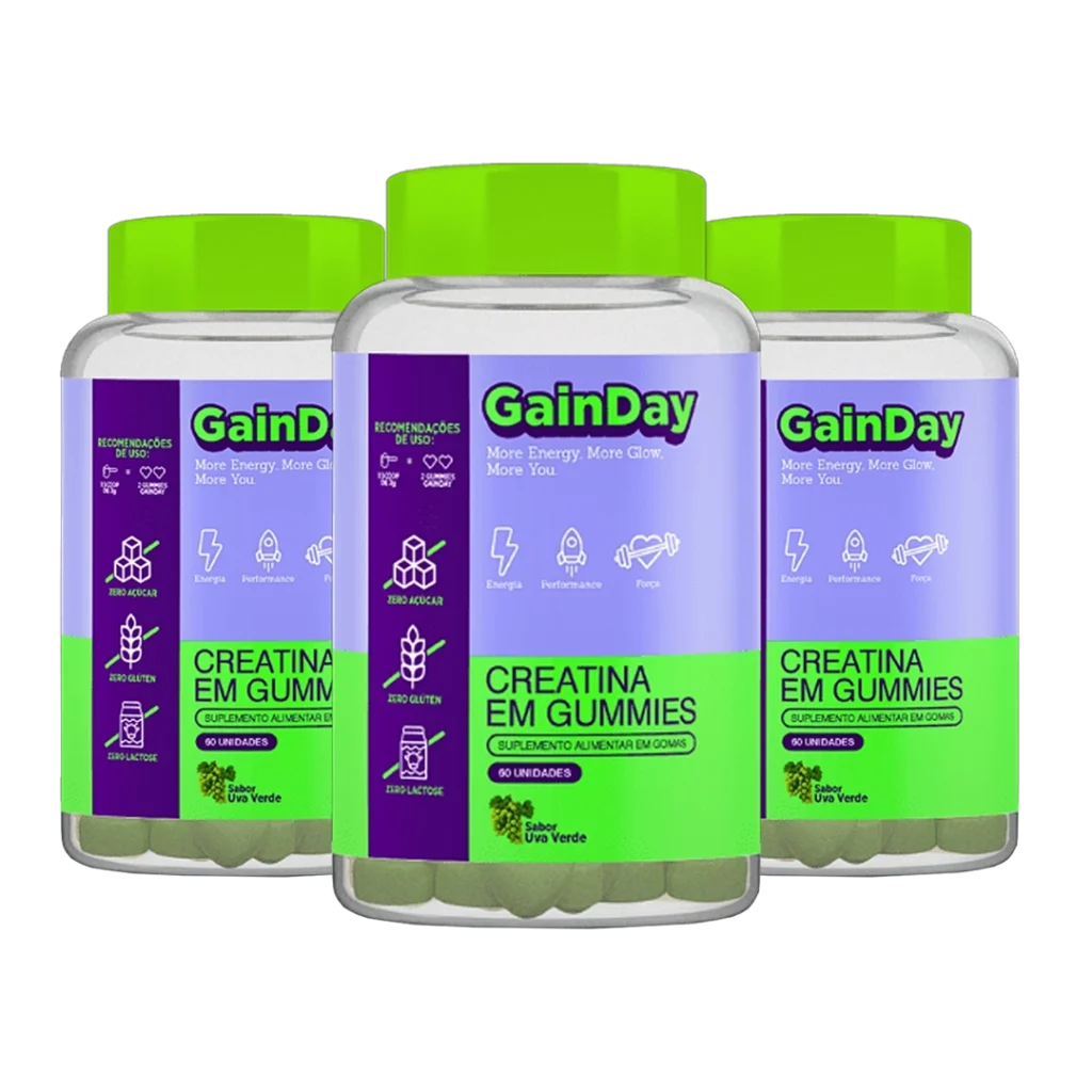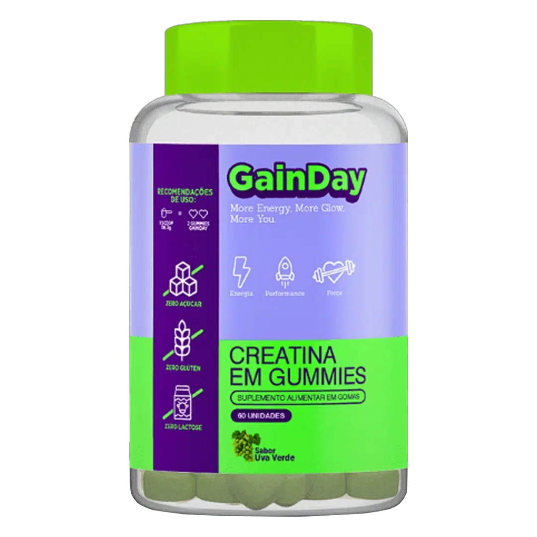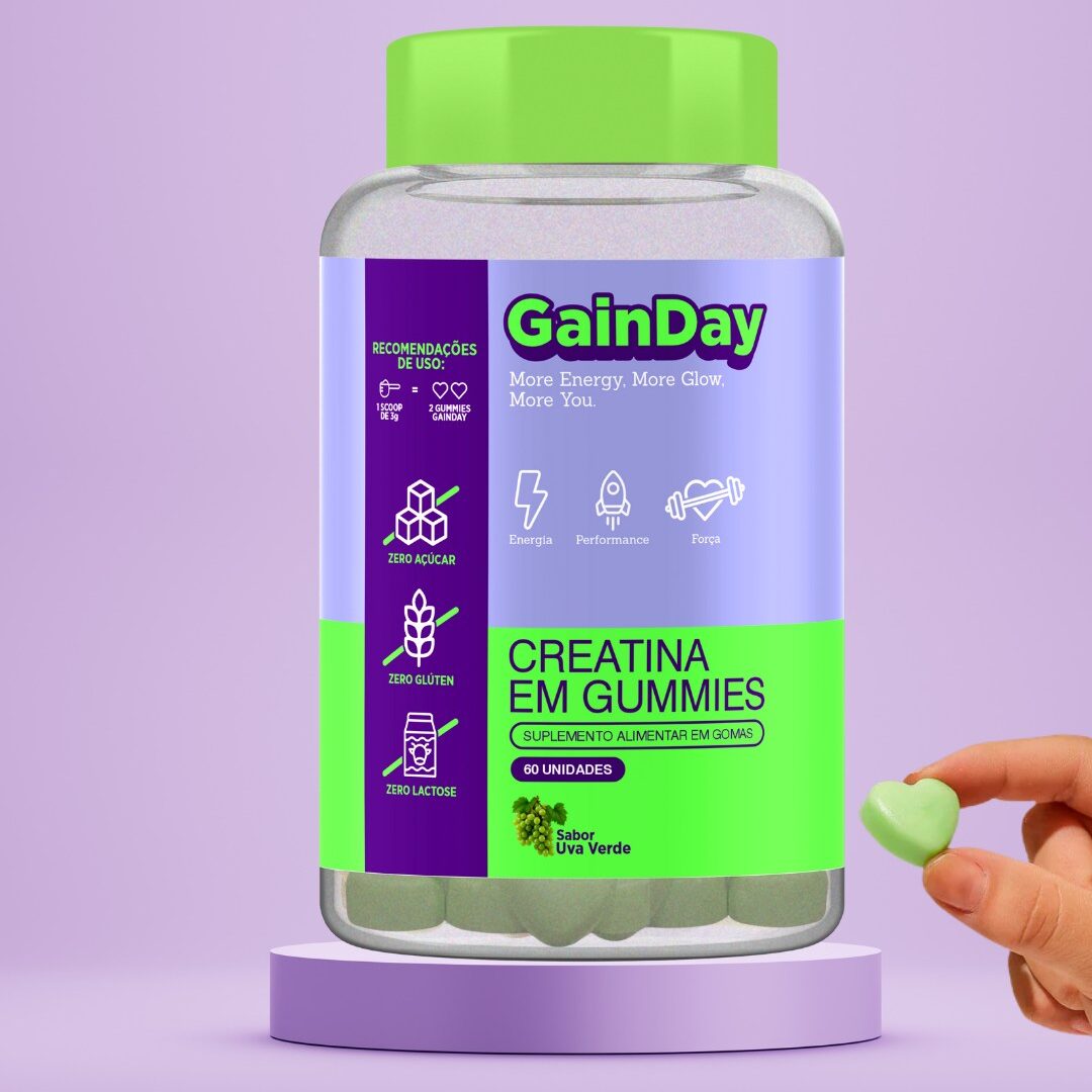 Gain day a Creatina em Gummi Pura sem açúcar e com sabor de uva verde irresistível.
