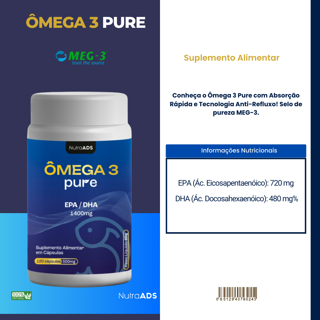 O Ômega 3 Pure é certificado pelo selo internacional MEG-3®, que garante um óleo de peixe ultrapuro, seguro e com alta concentração de EPA e DHA.